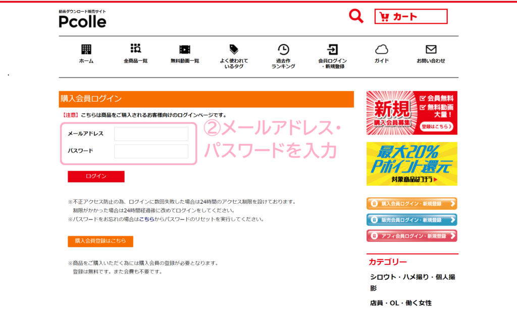 会員登録が完了したので、実際に購入会員ページにログインしてみようと思います。