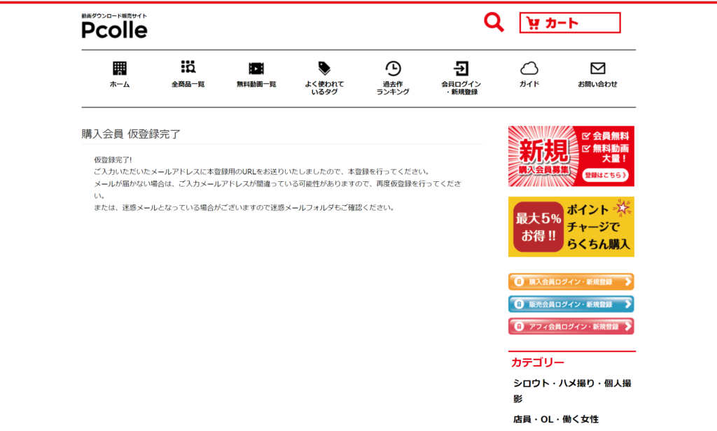 送信ボタンをクリックすると、購入会員 仮登録完了 の画面に切り替わります。